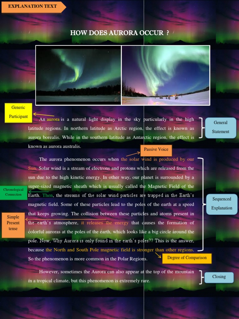 In the northern latitude, the effect is known as aurora borealis ( aurora: Conversation advertisement text text descriptive analytical text exposition english text course hi, english learners, kalau berbicara mengenai fenomena beasiswa explanation alam yang menakjubkan, kalian pasti sudah tak asing 2020 text lagi dengan aurora. In fact, the roman emperor tiberius thought a city was on fire, so he sent fire engines to that city. These collisions cause them to emit visible light at various wavelengths, creating the colors of the aurora. When these particles reach the earth's magnetic field, some get trapped. Well, let us explain it. Aurora an aurora is a flickering light mostly caused by the sun's radiation, usually found near the poles. Feb 02, 2014 · (8th) explanation text : Arti terjemahan explanation text tentang aurora Because the light of auroras is not strong enough, they are generally only visible at night. An aurora (latin word mean "sunrise") is natural light display in the sky in the poles (north and south) caused by the collision of energetic charged particles with atoms in the high altitude atmosphere. Auroras are the most visible effect of the sun's activity on the earth's atmosphere. Nov 06, 2014 · an aurora ( latin word mean "sunrise") is natural light display in the sky in the poles (north and south) caused by the collision of energetic charged particles with atoms in the high altitude atmosphere.